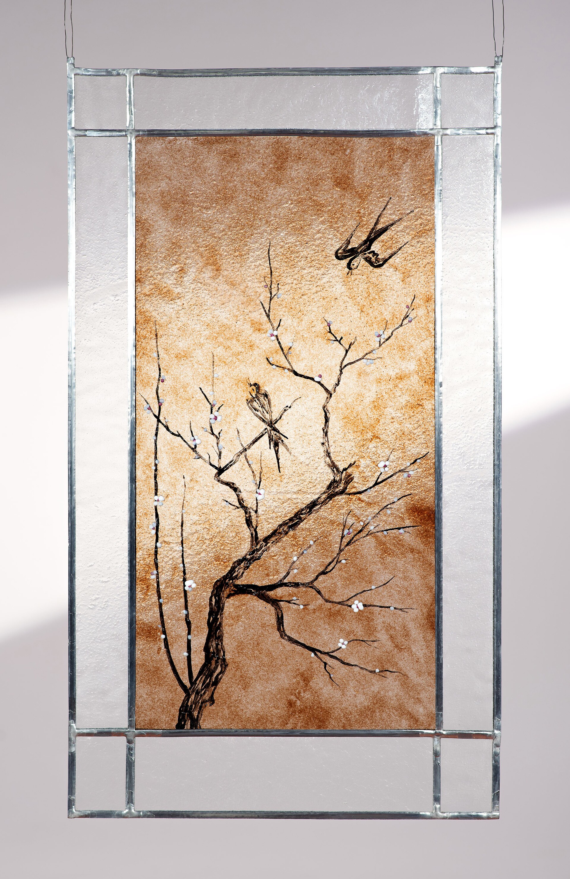 „Japońska sakura”, 2024, technika mieszana (puder, grys i emalia fusingowa, witraż) Praca przedstawia tradycyjną japońską fabułę: gałęzie kwitnącej japońskiej sakury z jaskółkami.